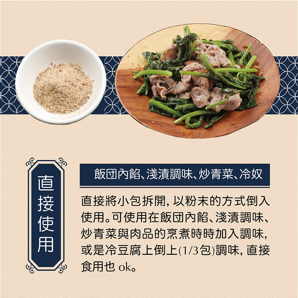 成分:風味原料(鰹節、鯖節、煮干沙丁魚、昆布、香菇)、食鹽、砂糖、酵母萃取物(酵母萃取物、糊精)、糊精、粉末醬油(醬油、糊精、食鹽)、菜種油